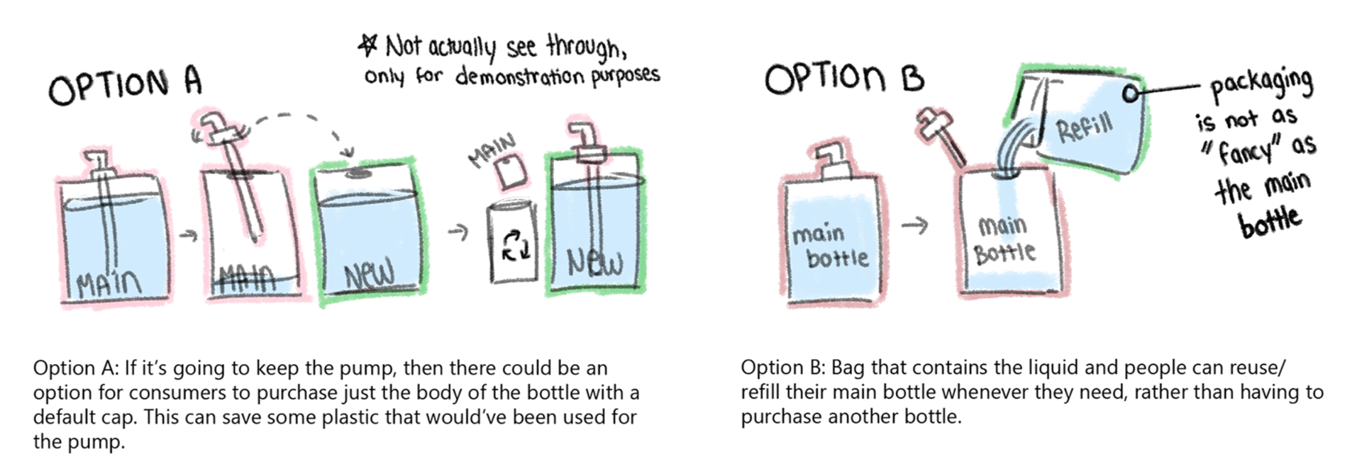 Recyclable materials / Refill packs to continue using the same bottle / Minimalistic print (mainly text, little to no images).